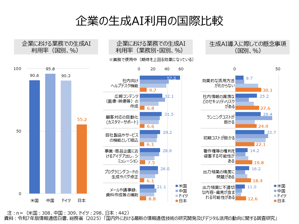 そうした中で、日本企業の生成AI利用は、他の国と比べて遅れているとの指摘や報道が数多くみられます。生成AIの開発では、日本は米国・中国に大きく離されていますが、企業の生成AI活用状況でも、海外企業と比べても遅れているということになります。